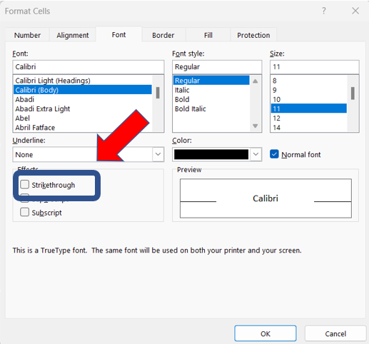 | Home | Font | Strikethrough | ![]() | უჯრაში არსებული/მონიშნული სიმბოლოებისთვის გადახაზვის ეფექტს დაყენება |
