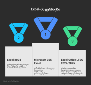 - Microsoft 365 – გამოწერის (subscription) მოდელი, სადაც Office/Excel-ის „ვერსიები“ უფრო ნაკლებად ჩანს, რადგან პროგრამა მუდმივად ახლდება და ახალი ფუნქციები ეტაპობრივად ემატება.