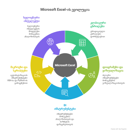Excel ამ ეკოსისტემის გულში იყო და არის – რეალურად Office-ის დანარჩენი პროგრამები ხშირად სწორედ Excel-ის ცხრილების გარშემო „ბრუნავენ“.