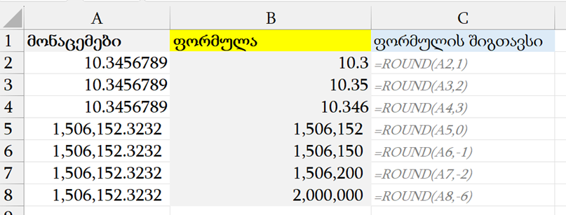 B6 უჯრაში მივიღეთ 1,506,150, ვინაიდან num_digits-ში მითითებულია -1. ეს ნიშნავს, რომ მრგვალდება ათეულებზე – ბოლო ციფრი (2) ნაკლებია 5-ზე, ამიტომ დარჩა ქვედა ათეული.