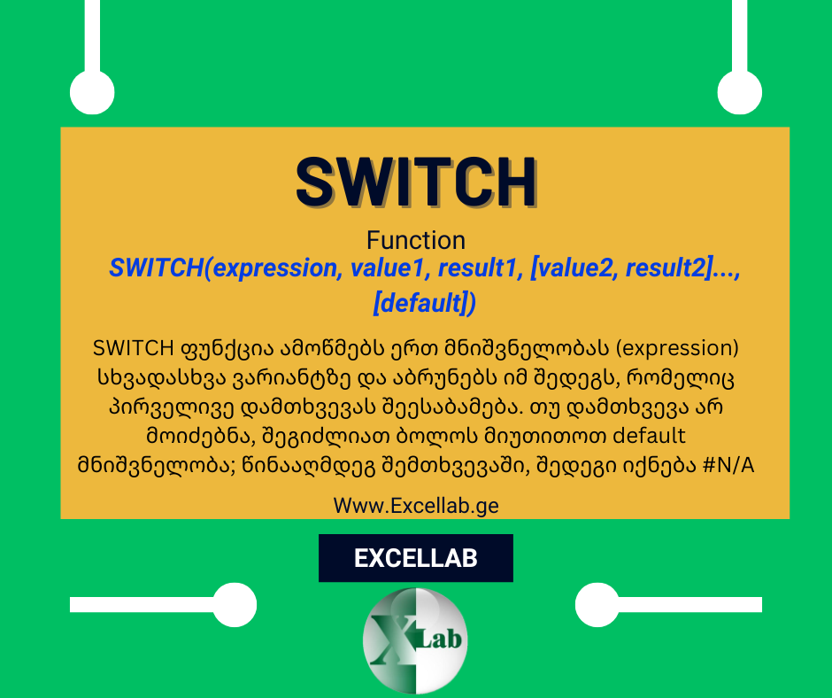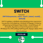 ფორმულის სახელი: SWITCH ფორმულის ტიპი: ლოგიკური ფორმულის აღწერა: SWITCH ფუნქცია ამოწმებს ერთ მნიშვნელობას (expression) სხვადასხვა ვარიანტზე და აბრუნებს იმ შედეგს, რომელიც პირველივე დამთხვევას შეესაბამება. თუ დამთხვევა არ მოიძებნა, შეგიძლიათ ბოლოს მიუთითოთ default მნიშვნელობა; წინააღმდეგ შემთხვევაში, შედეგი იქნება #N/A ფორმულის მოწყობა: …